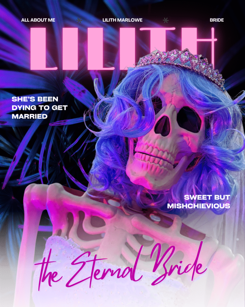 Some say she vanished mid-creation during one of her late-night painting sessions, brush in hand, as if her art had pulled her into a world of her own making. Now in the afterlife, Lilith Marlowe is forever the eternal bride: sweet, mischievous, creative, and with a secret love of danger lurking just beneath her blushing exterior.